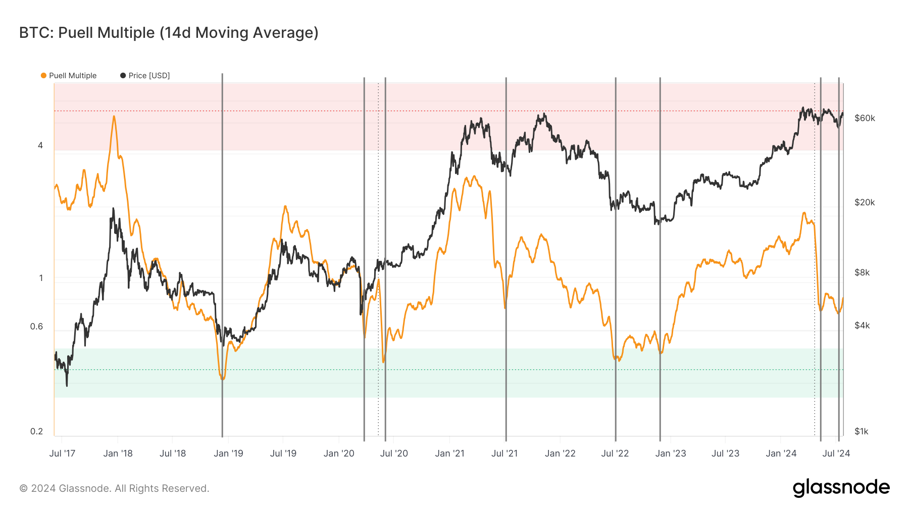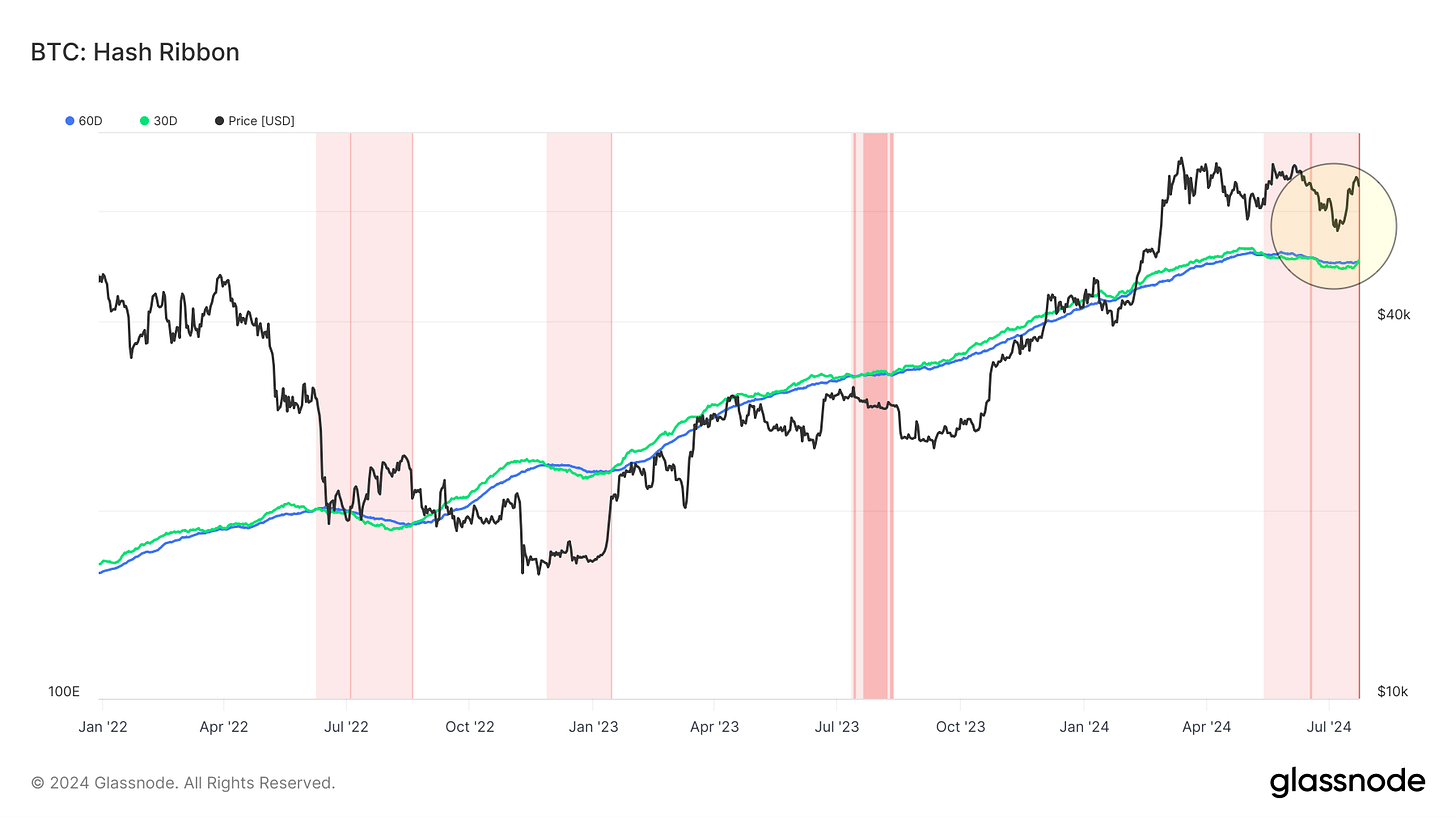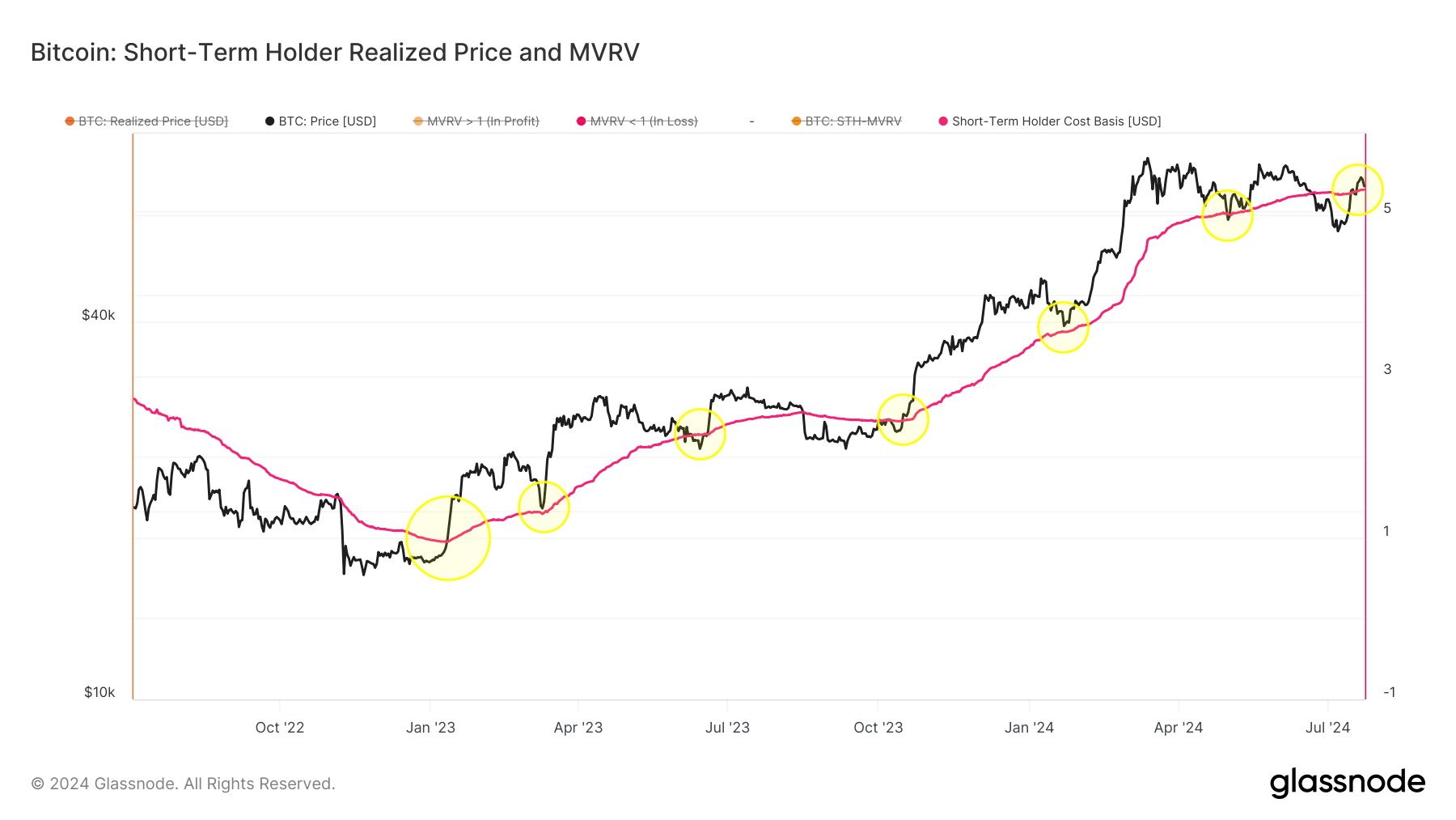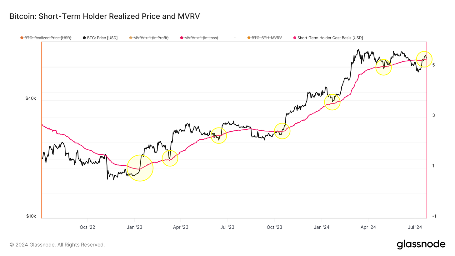 Además, como hemos venido mencionando, el costo base de los holders a corto plazo es el indicador en cadena más preciso para identificar niveles de soporte y resistencia. Tras la caída de precios en junio, este costo base se ha convertido en un nivel de resistencia. Si Bitcoin logra superar esta barrera, es probable que veamos precios mucho más altos en las semanas y meses siguientes, similar a lo que ocurrió en el cuarto trimestre de 2023.