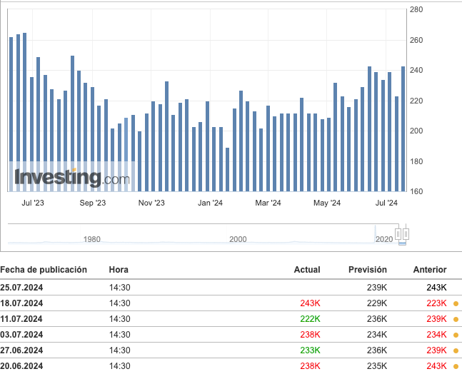 La semana pasada, en el ámbito macroeconómico, las solicitudes iniciales de subsidio por desempleo en EE.UU. aumentaron a su nivel más alto desde agosto del año pasado, alcanzando las 243,000. Este aumento se debió en parte a un incremento en las solicitudes provenientes de Texas debido al huracán Beryl, pero incluso dejando eso de lado, las solicitudes han aumentado constantemente a lo largo de 2024.