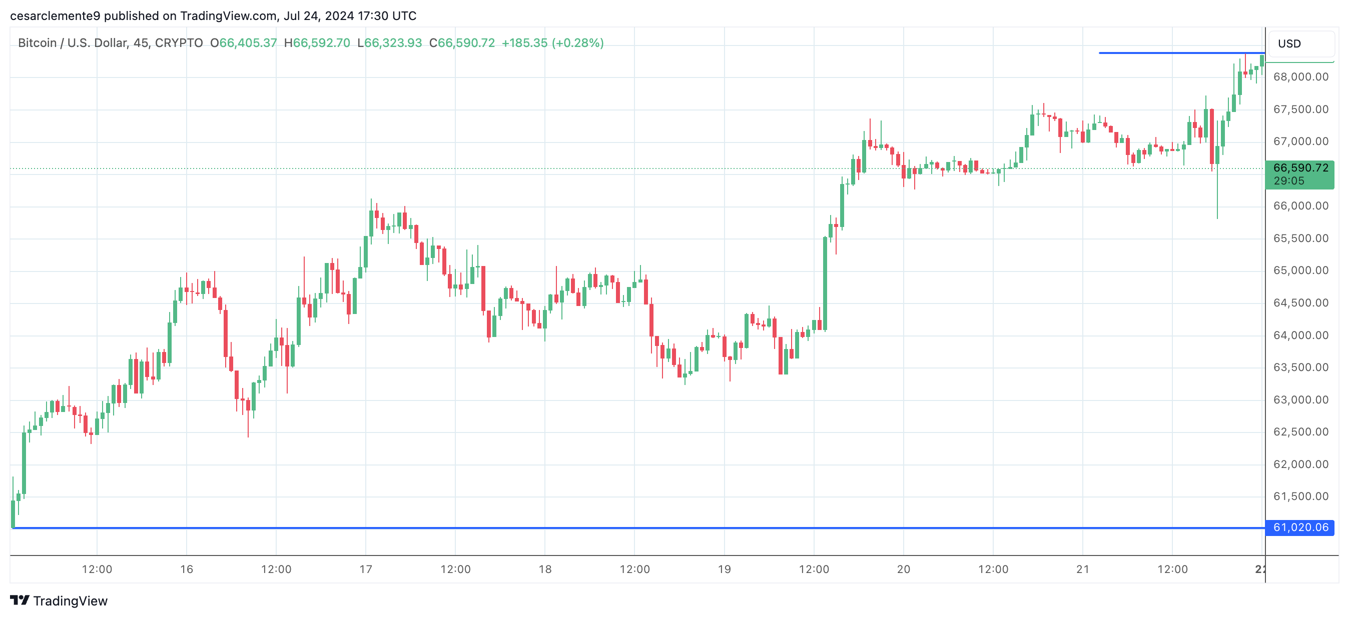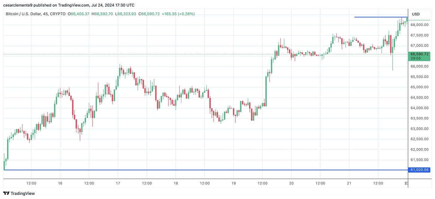 La semana pasada, el precio de Bitcoin (BTC) tuvo un comportamiento positivo, logrando un aumento del 12%. El precio osciló entre $61.000 y $68.400, lo que ha sido una buena noticia para los inversores.