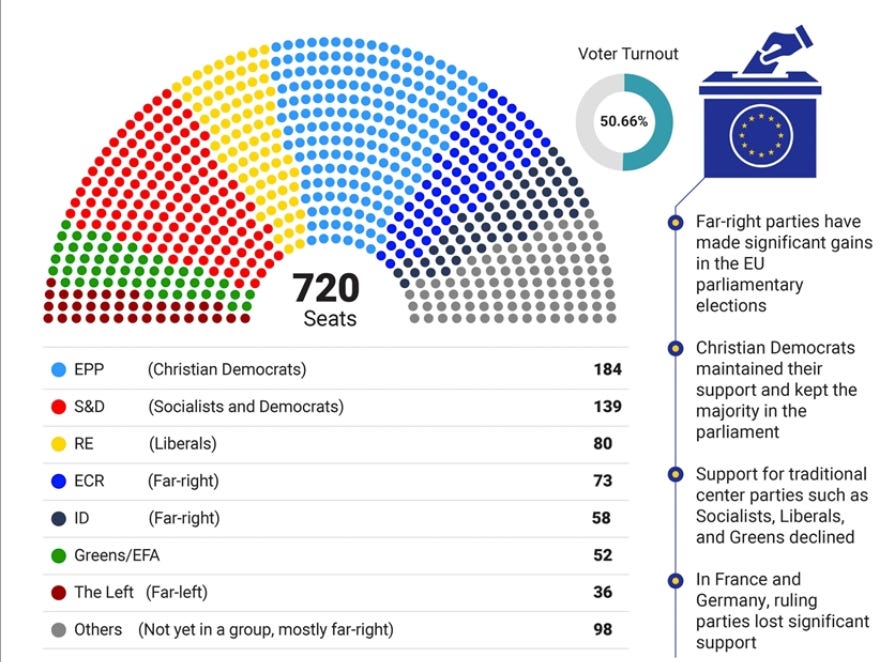 Hay dos nuevos grupos de extrema derecha: Europe of Sovereign Nations, con 25 miembros, y Patriots for Europe, con 84 eurodiputados. Juntos, junto con los Conservadores y Reformistas Europeos, ahora constituyen más de una cuarta parte del parlamento. Sin embargo, no fue suficiente, ya que los partidos centristas decidieron reiterar su apoyo a von der Leyen.