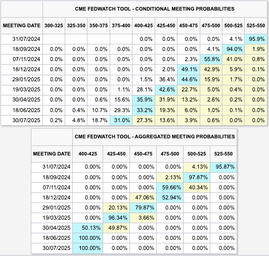 Powell ha aludido a su deseo de recortar las tasas de interés de manera preventiva, antes de una ola de desempleo masivo o recesión. Cualquier dato que sugiera que nos dirigimos en esa dirección le dará a Powell justificación para recortes de tasas a corto plazo; un hecho que se está considerando cada vez más. Así se encuentran las expectativas de los inversionista con respecto a las tasas de interés: