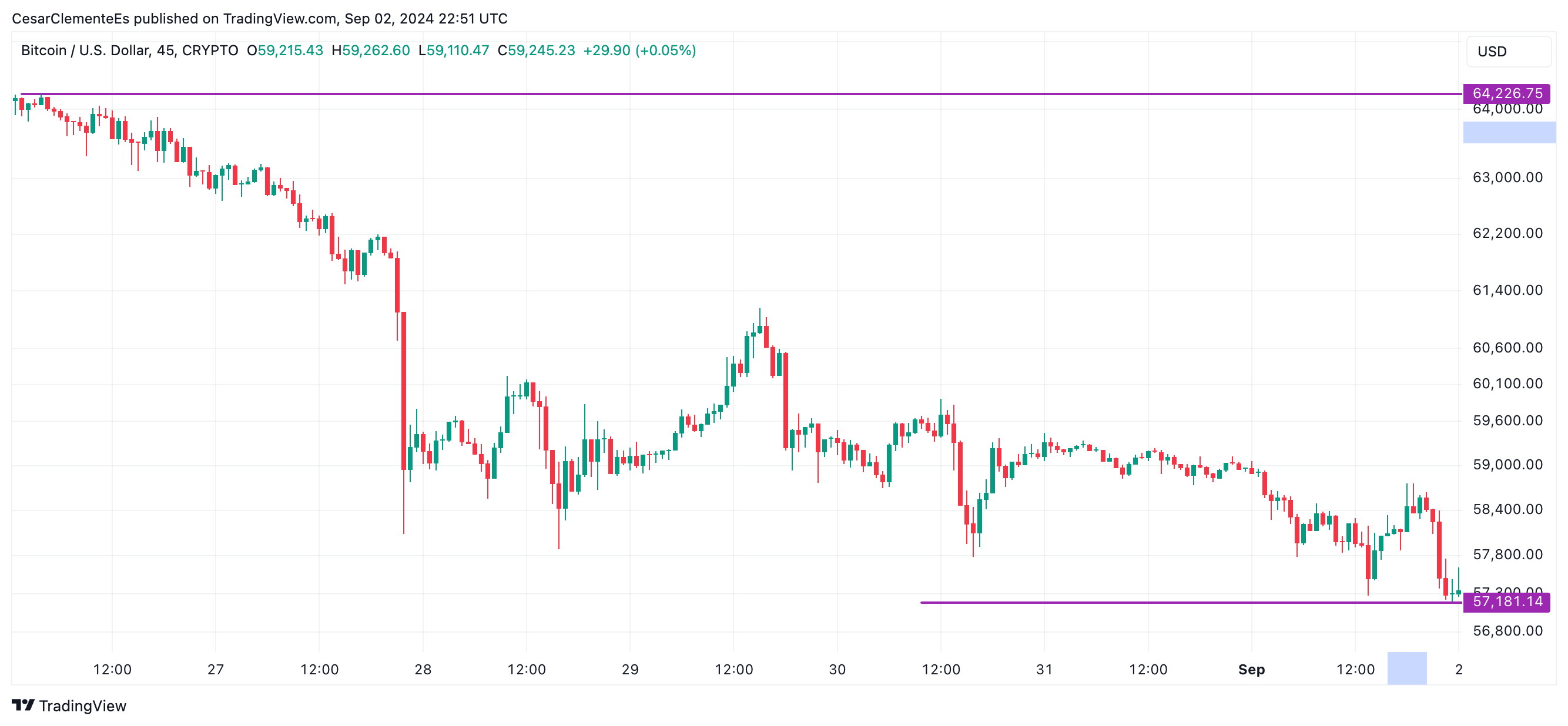La semana pasada, el precio de Bitcoin experimentó una caída del -10,5%, con fluctuaciones entre $57.181 y $64.226. Durante el último mes, el mercado ha estado moviéndose lateralmente dentro del rango de $56.000 a $64.000, lo que indica un período de consolidación antes de un posible movimiento.