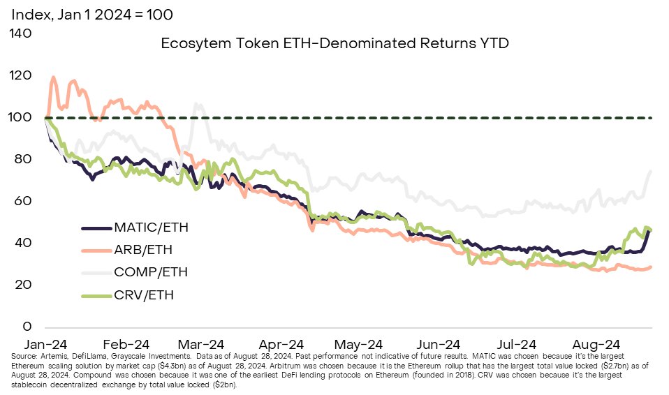 En paralelo, Grayscale, una de las empresas líderes en la gestión de activos digitales, publicó un informe exhaustivo sobre el ecosistema de Ethereum. El informe analiza el rendimiento de los tokens basados en Ethereum en comparación con su activo subyacente, ETH. Los hallazgos revelan que, en mercados alcistas anteriores, algunos tokens relacionados con Ethereum, especialmente aquellos vinculados a las finanzas descentralizadas (DeFi) o a soluciones de escalabilidad de capa 2, han ofrecido retornos superiores en comparación con simplemente mantener ETH. No obstante, esta estrategia también conlleva un mayor riesgo, ya que no todos los tokens del ecosistema han tenido un rendimiento positivo. De hecho, muchos han tenido un desempeño notablemente inferior al de ETH en lo que va del año.