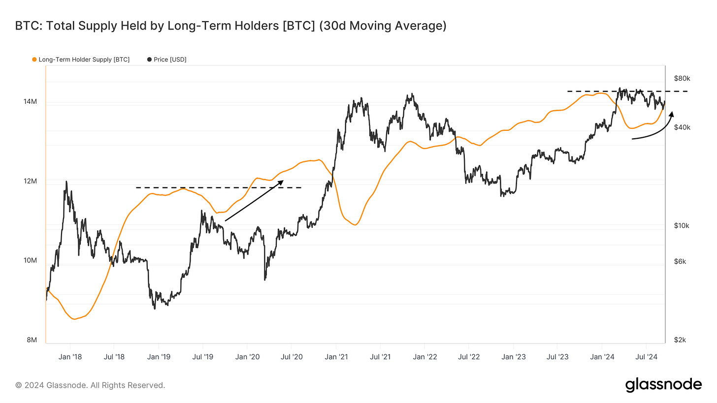 La cantidad de BTC en manos de inversores a largo plazo está cerca de alcanzar un nuevo máximo, algo similar a lo que sucedió en 2019-2020. En ese período, muchos de estos inversores vendieron para asegurar ganancias, pero luego, cuando el precio se “estabilizó”, comenzaron a acumular de manera agresiva. Esta acumulación provocó una contracción de la oferta a finales de 2020, lo que impulsó el precio de Bitcoin de $10.000 a $50.000.