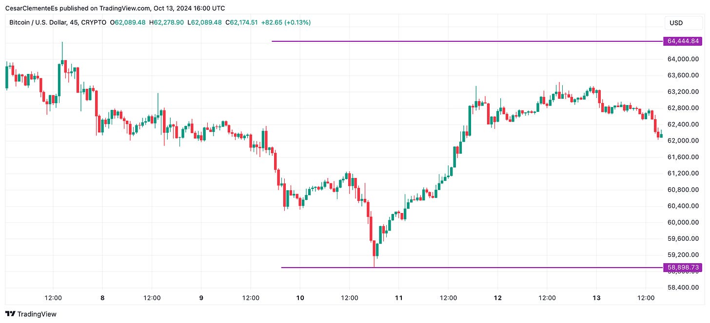 Esta semana, Bitcoin continuó con su volatilidad característica, logrando marcar otro "mínimo más alto". Aunque cerró la semana con una rentabilidad de -1,76%, el jueves llegó a tocar los $58.900 antes de recuperarse hacia finales de la semana, alcanzando los $62.000